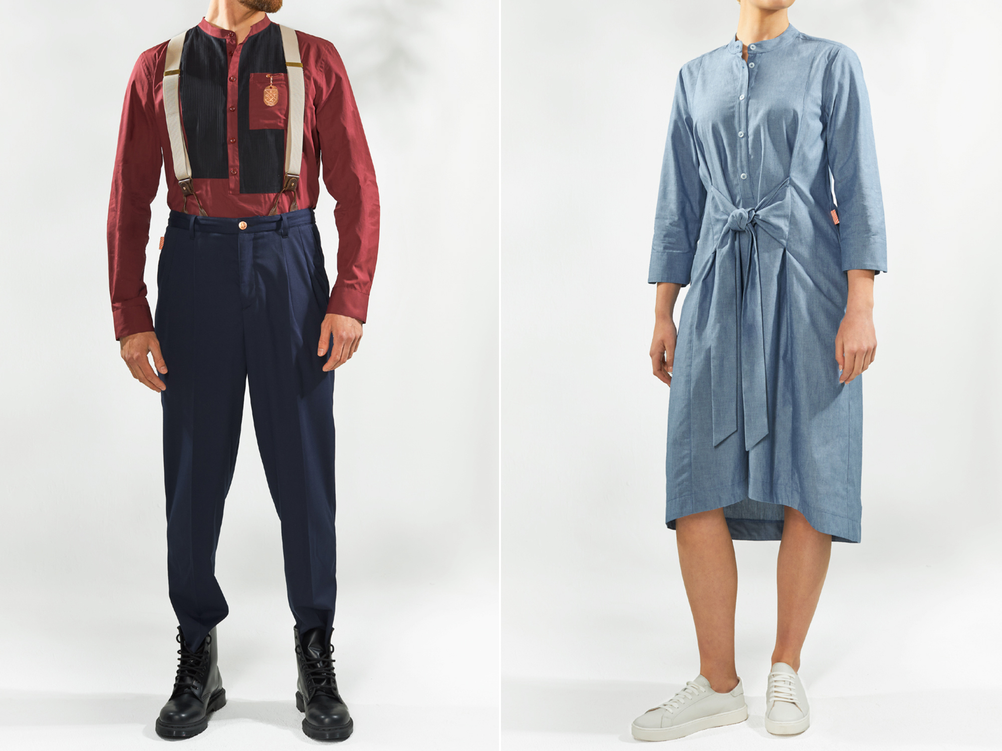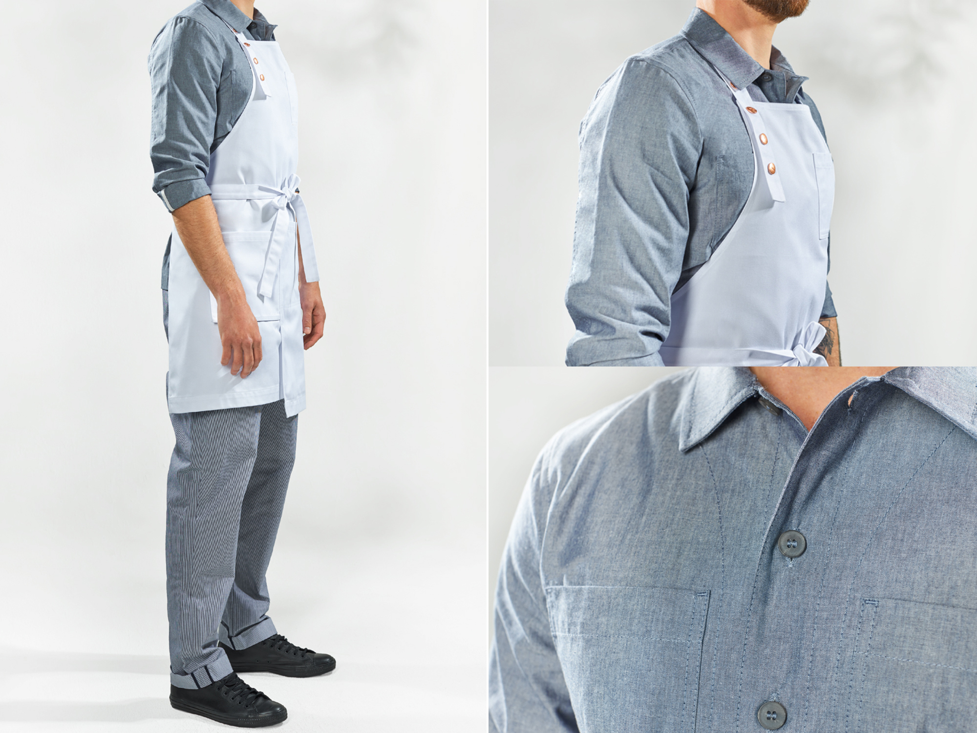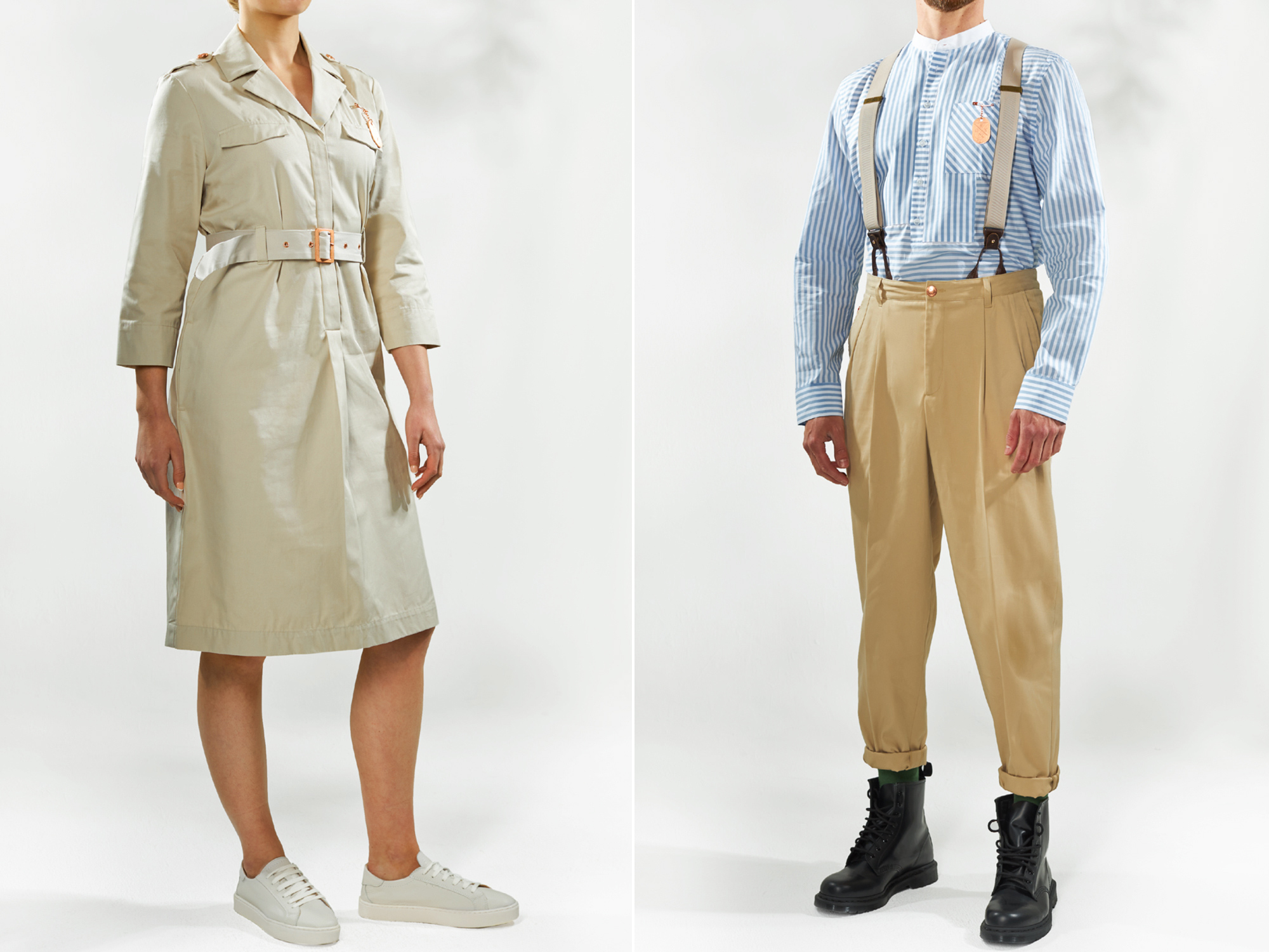 Finally, a wonderful summation of Studio 104's approach to the brief and the client's ambition arrived in the uniform's metal hardware, where modern fashion and streetwear meets one-of-a-kind heritage and storytelling. Each of the staff were given punk-inspired safety pins came with dog tags attached, in a pop colour of copper, also seen in the button detailing through the range. This truly exemplified the client's key aim of achieving that one-off experience.