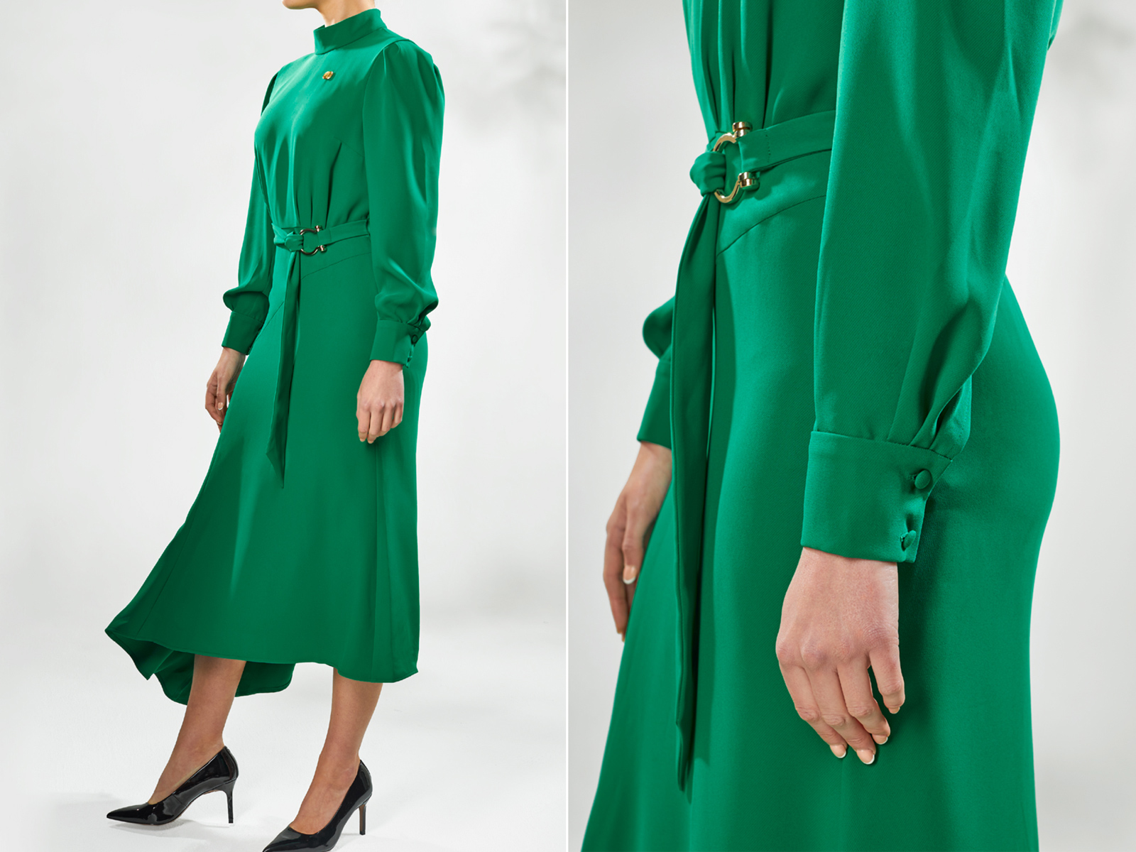 The uniforms for the atrium staff showcase a colour palette of blues and strong greens. The standout piece, a saturated green dress with a tie waist and asymmetric seam details which reflect the angles within the NoMad logo.
