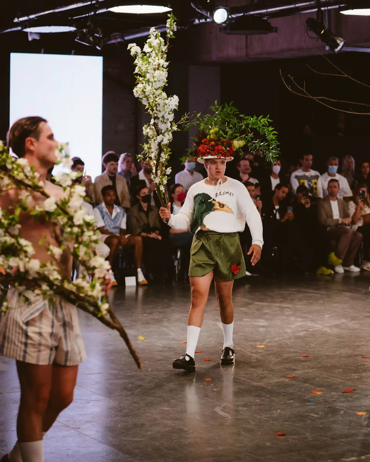 Steven Stokey-Daley’s debut was one of the stand-out shows. Swapping the traditional catwalk for a theatre performance featuring the National Youth Theatre. The play called ‘Class’ explored the diverse cast’s personal and shared experiences at both private and state schools. High points included an embroidered rugby shirt, tapestry shorts and paisley bomber jacket all made from vintage fabrics and deadstock materials - All topped off with Flower-decorated boaters.