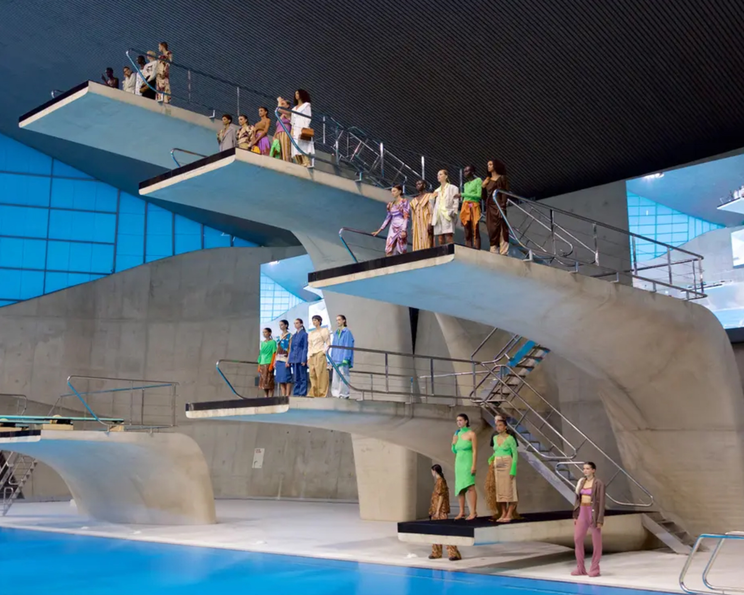 Another who used the London Aqautics Centre as a backdrop was David Koma. Taking inspiration from Annette Kellerman, a champion synchronised swimmer who was one of the first women to wear a one-piece swimsuit, David Komas SS22 collection shows us the versatility of swimwear as eveningwear. Again another designer taking advantage of the effect of the Olympics.