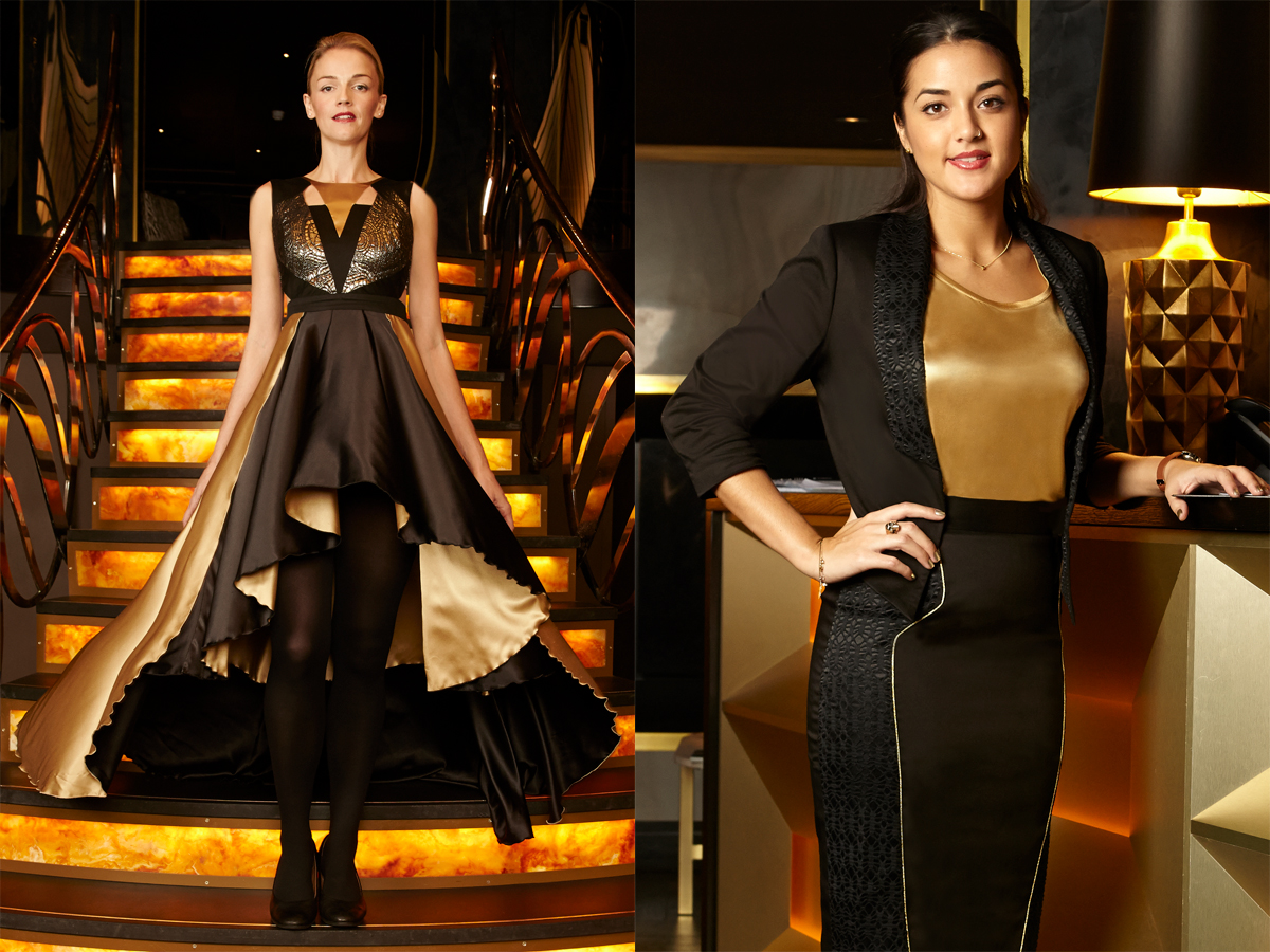 Influenced by the new interior, artworks and graphics, the gold and black Art Deco-inspired palette and geometric pattern retains the restaurant’s glamorous past and is carried seamlessly throughout the bespoke uniform design.