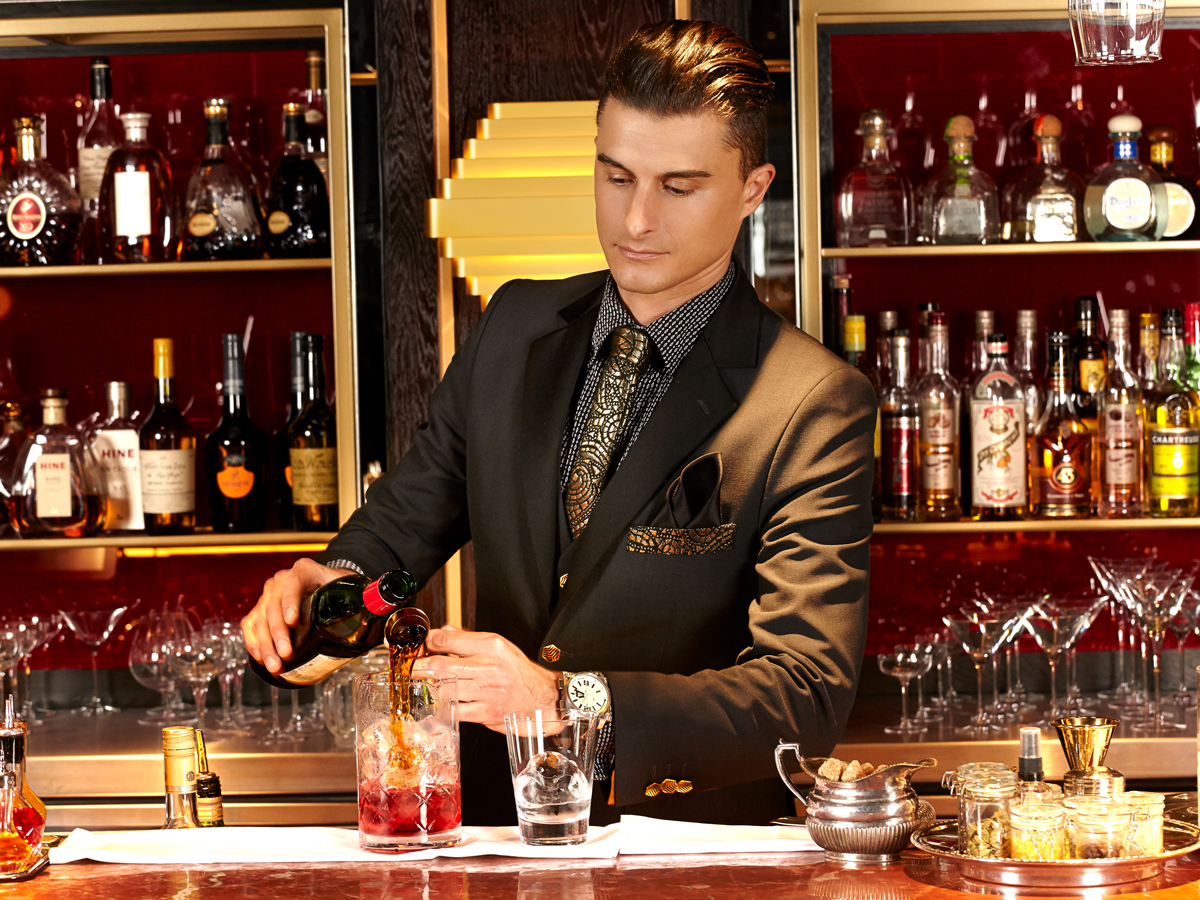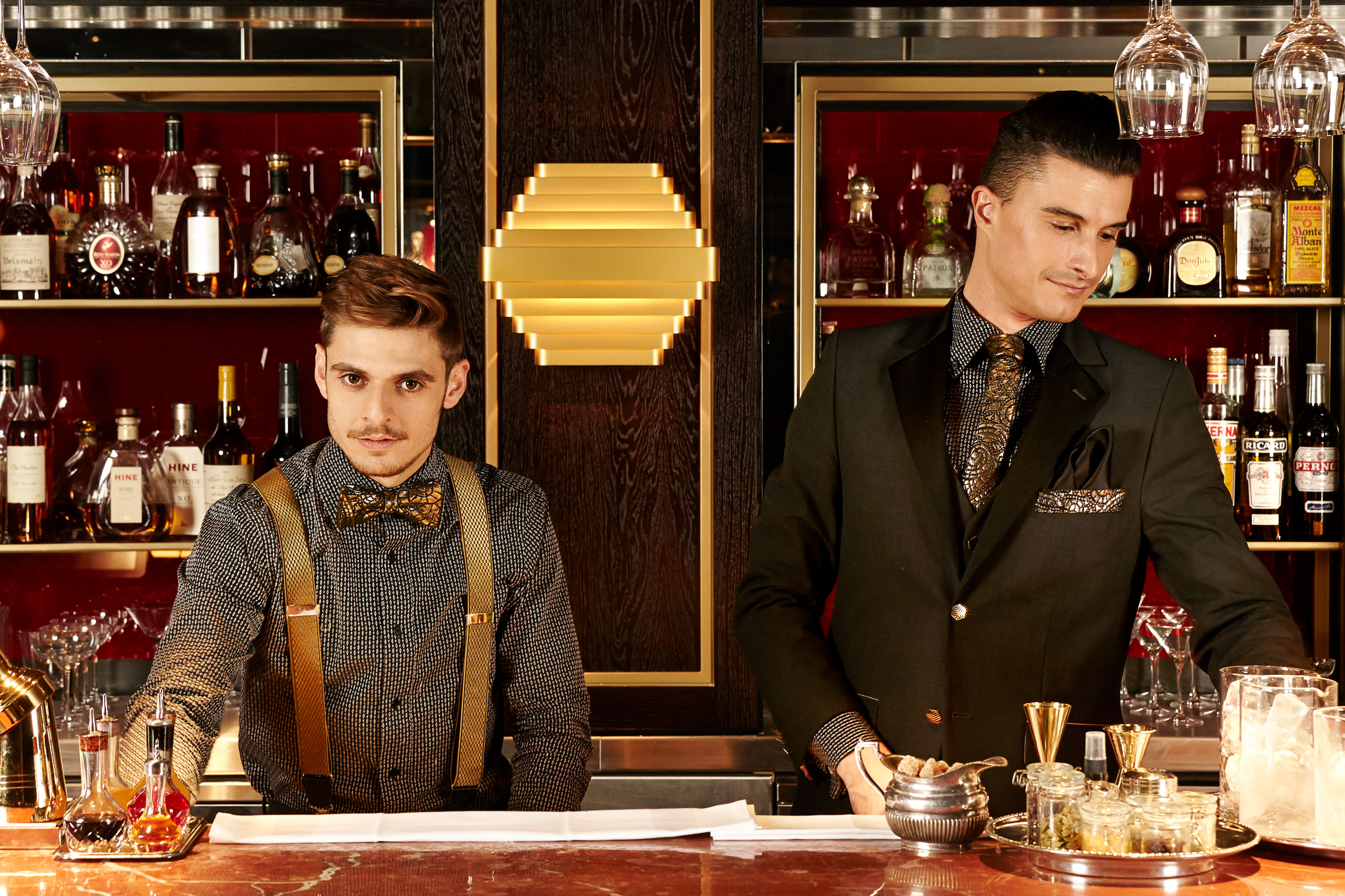 Taking inspiration from the chic Quaglino’s cigarette girls of the 90s, our creative team designed an iconic couture hostess dress, which has fast become a talking point at the cocktail bar. The mens’ suits have a contemporary slim fit with gold edging and trim detail. Luxury suiting fabric contrasts with satin lapels and evening trouser stripes and liquid gold geo Jacquards add to the glamorous cabaret feeling.